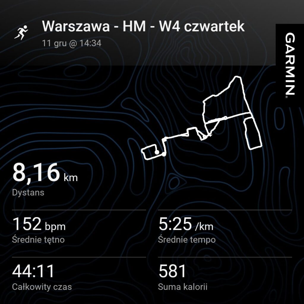 W trakcie wyszło też, że skróciłem sobie pierwszą regenerację, bo na Garminie wyskoczyło mi ostrzeżenie przed spadkiem ciśnienia atmosferycznego i jak zwykle próbując je usunąć… skończyłem regenerację po 8,5 sekundy. Damn. Ktoś wie, którym guzikiem się to gunwo usuwa? Ale nic to – potem poszło jak złoto, każdy kilometr w granicach 5:00. W zasadzie każdy poniżej, z wyjątkiem drugiego, gdy chwila minęła zanim się zorientowałem, że to już nie jest regeneracja.