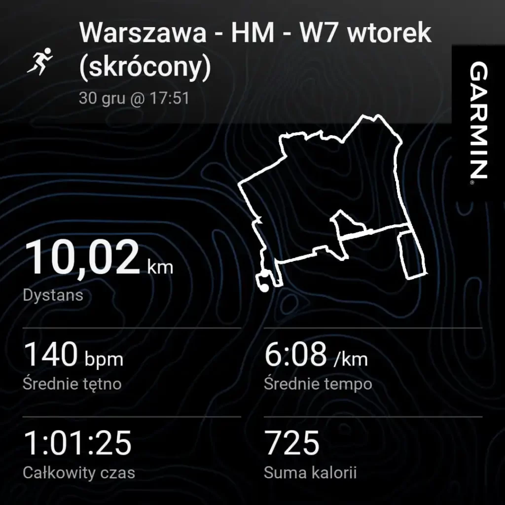 Albo przynajmniej zawieje śnieżne mogłyby się dziać poza godzinami mojego biegania. Dzisiejszy, ostatni w 2025 roku trening, i tak skróciłem, bo wciąż delikatnie (tak 2,5/10) czuję uda po sobotniej połówce. A ponieważ mądry biegacz nie kieruje się ego i instagramem tylko reakcjami organizmu, urwałem 2 km z planu i sprinty po pierwsze nieco spowolniłem, po drugie zaś – z 4*200 m zrobiłem 3*100.