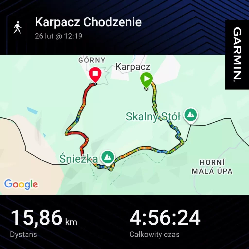 Styknie? No nie. Przede mną 3 km zejścia, w co najmniej 60% wypełnionego – werble – litym lodem! To, że wypier*** się na nim i zjechałem ponad 100 metrów na dupie i plecach tylko raz, to fenomen. Dodajmy do tego spacer na dworzec, pociąg do Jeleniej Góry, tam szybki spacer, żeby zdążyć na standup, szybki powrót na ostatni pociąg i już w Karpaczu 2,5 km do hotelu… Mamy ostatecznie prawie 36 tys. kroków, a następnego dnia oba pośladkowe krzyczące: